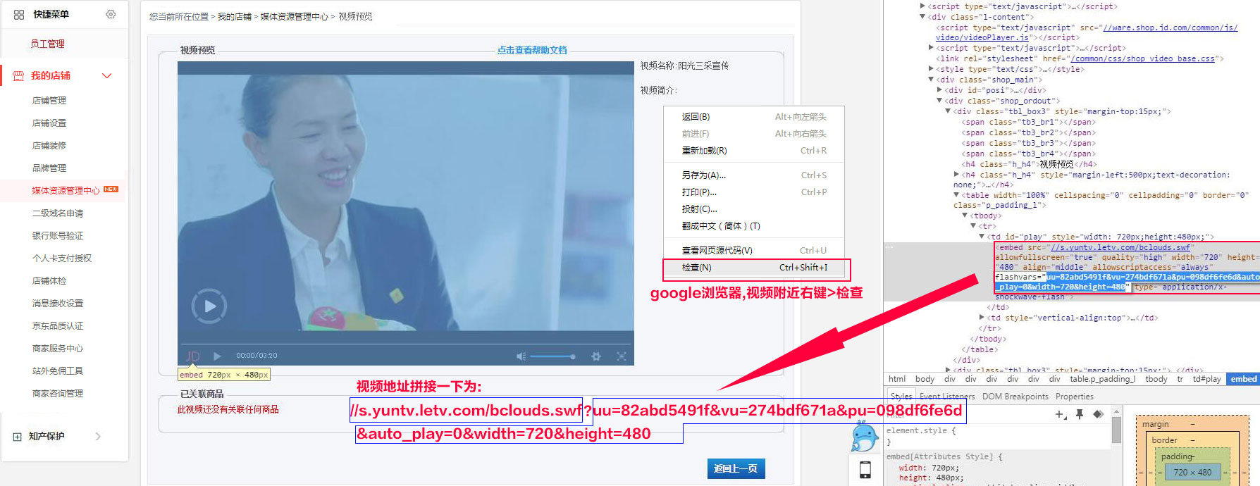 方法二:視頻上傳到這里之后獲得視頻地址(用google瀏覽器)點擊視頻預(yù)覽,之后在視頻的旁邊一點,點擊右鍵>檢查>找到視頻的元素位置